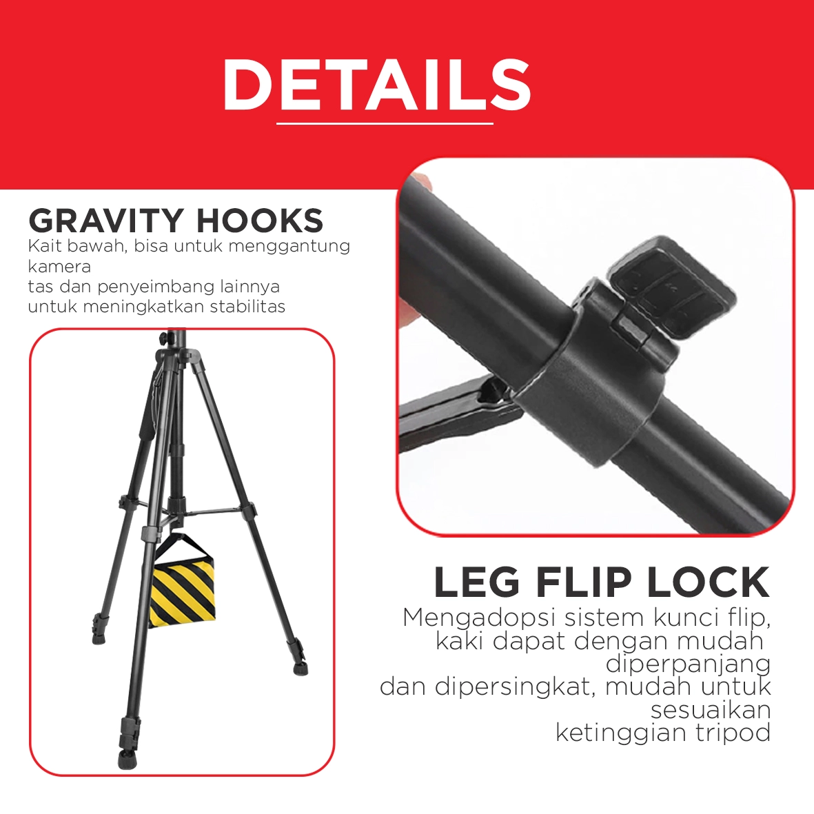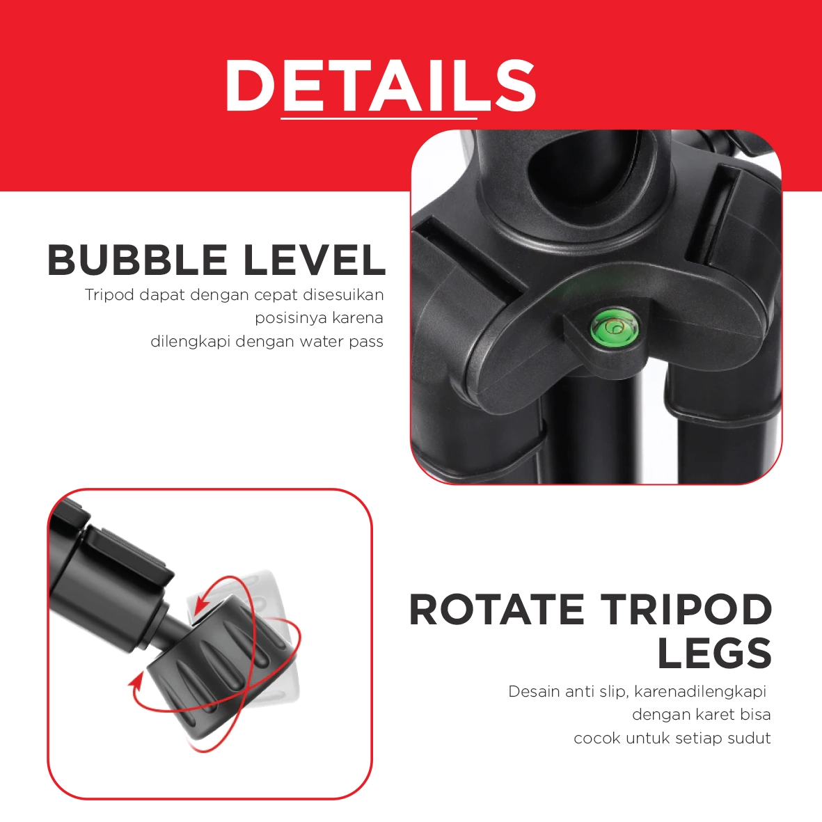 Allows for easy shooting from various angles, as well as quick and convenient height and angle adjustments with the flip-lock system. Equipped with anti-slip rubber on the ends of the legs, ensuring the tripod remains stable on various surfaces, keeping your equipment safe during shooting.