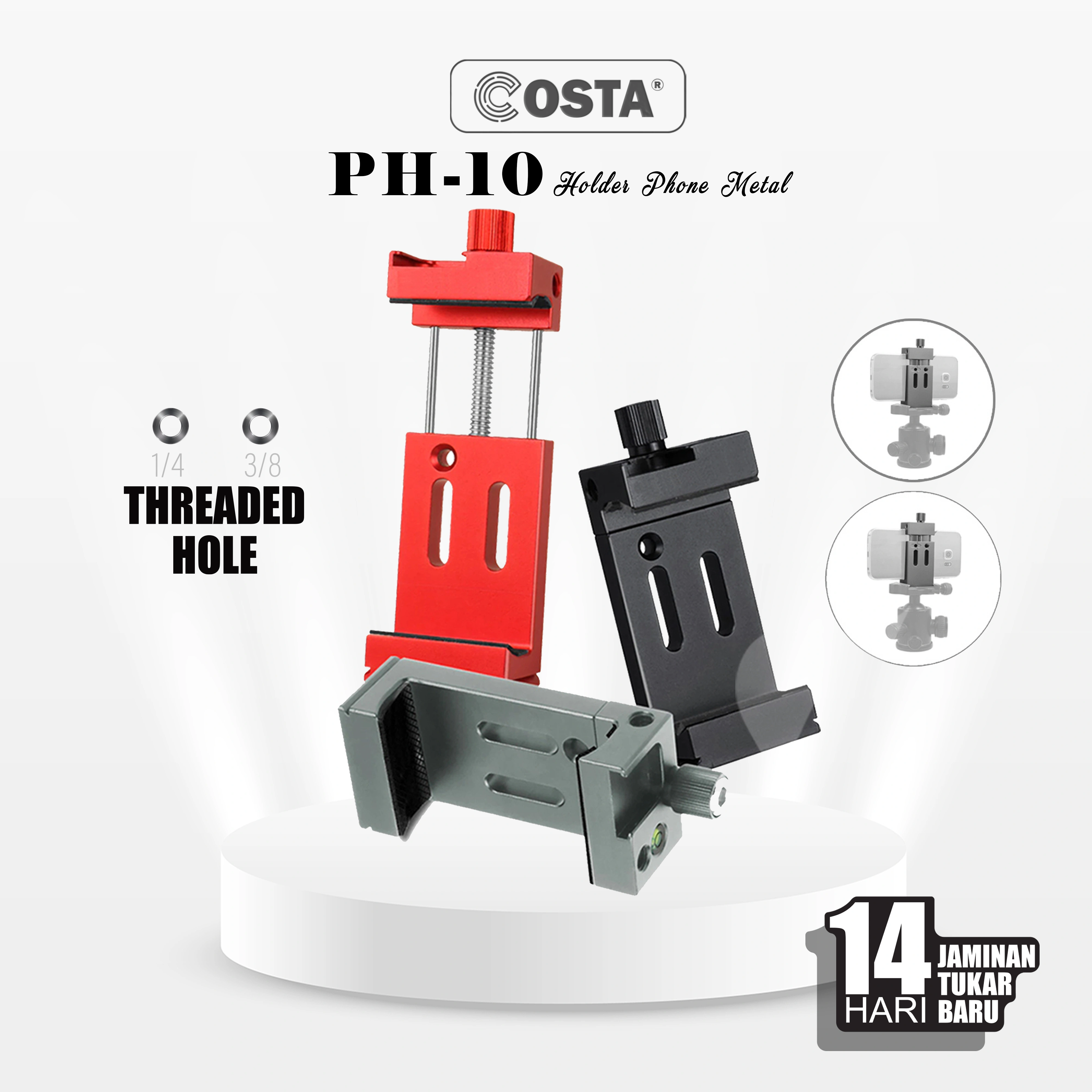 COSTA PH-10 CNC Aluminum Universal Phone Mount Holder Adapter is a smartphone holder designed with high precision using a CNC process. Made from sturdy aluminum, this holder is able to support all types of smartphones with a width of 6-9 cm. Equipped with a standard 1/4" thread and Cold Shoe, this holder allows you to add various accessories such as lights or microphones, making it ideal for professional photography and videography needs.